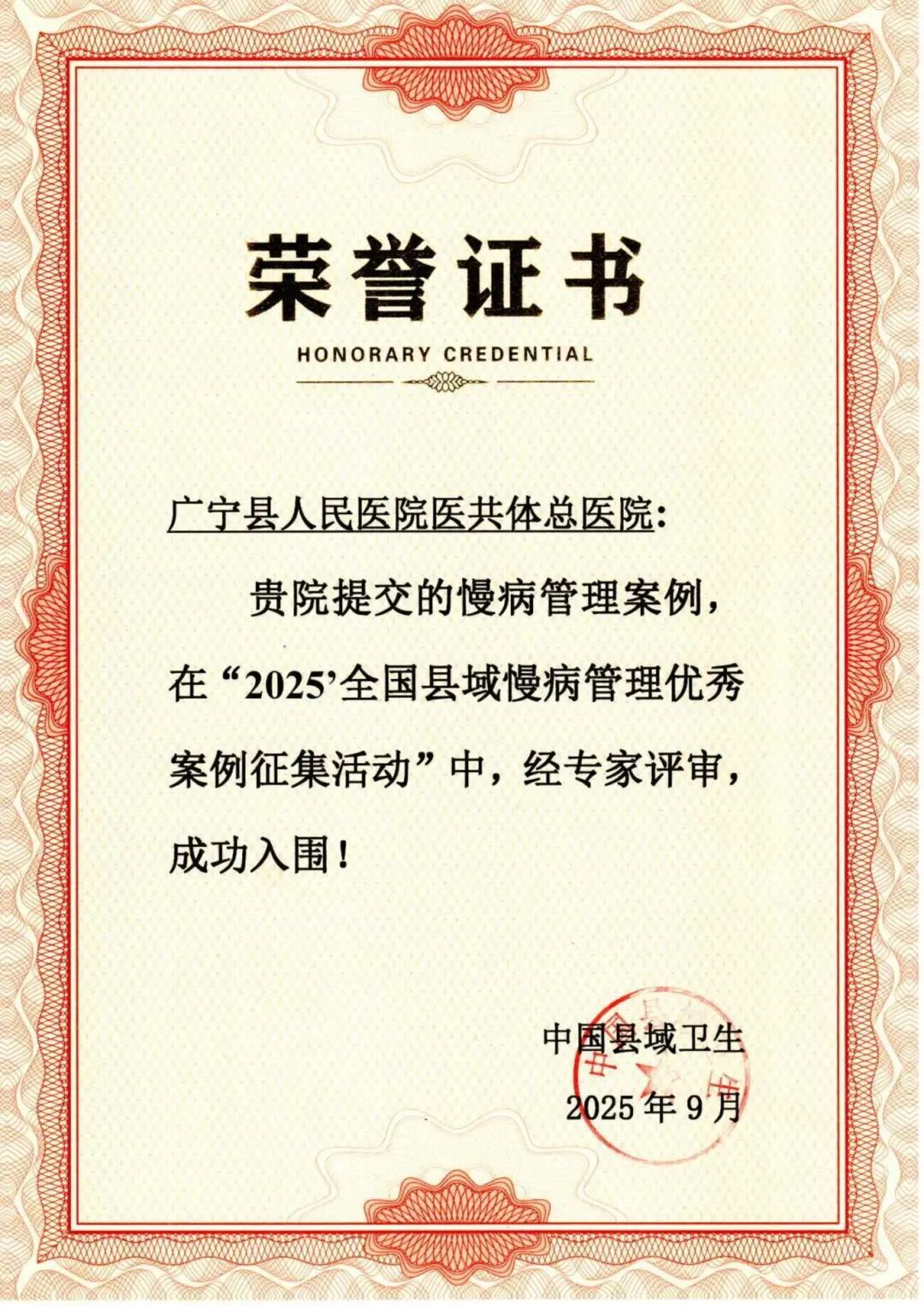 近日,广宁县人民医院医共体总医院报送的《“五维发力”织密公卫慢病防护网,广宁县医共体慢病管理连续三年交出“优等生”答卷》案例,成功入选“2025年全国县域慢病管理优秀案例”,充分体现了广宁县在慢性病综合防控方面的系统成效与模式创新。