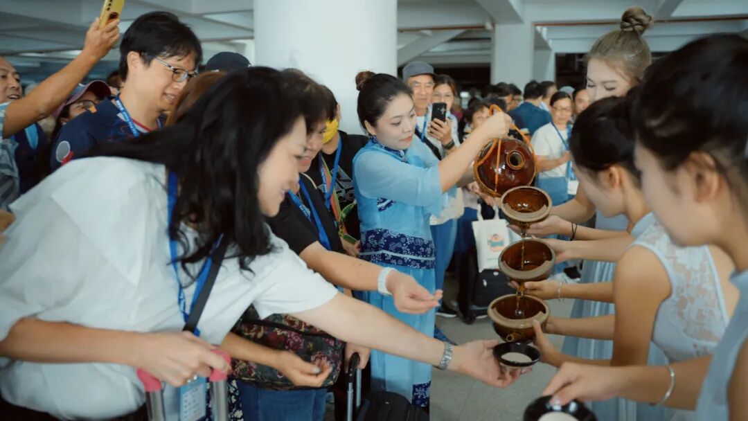 最具仪式感的敬客家娘酒环节将现场气氛推向高潮。身着传统客家服饰的客家女端着盛满娘酒的瓷碗,逐一为远道而来的游客送上祝福,醇厚的酒香与真挚的情谊在空气中弥漫,温馨融洽的氛围让游客们切实体会到河源人民的热情与敬意。“温热的娘酒喝下去暖暖的,这份心意太实在了!” 香港游客张先生说道。