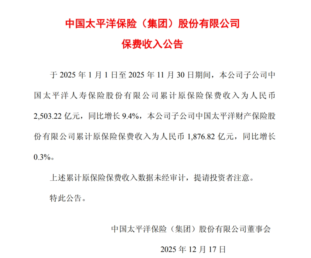 12月17日,中国太保发布保费收入公告显示,1-11月子公司中国太平洋人寿保险股份有限公司累计原保险保费收入为2503.22亿元,同比增长9.4%;子公司中国太平洋财产保险股份有限公司累计原保险保费收入为1876.82亿元张吧策路,同比增长0.3%。