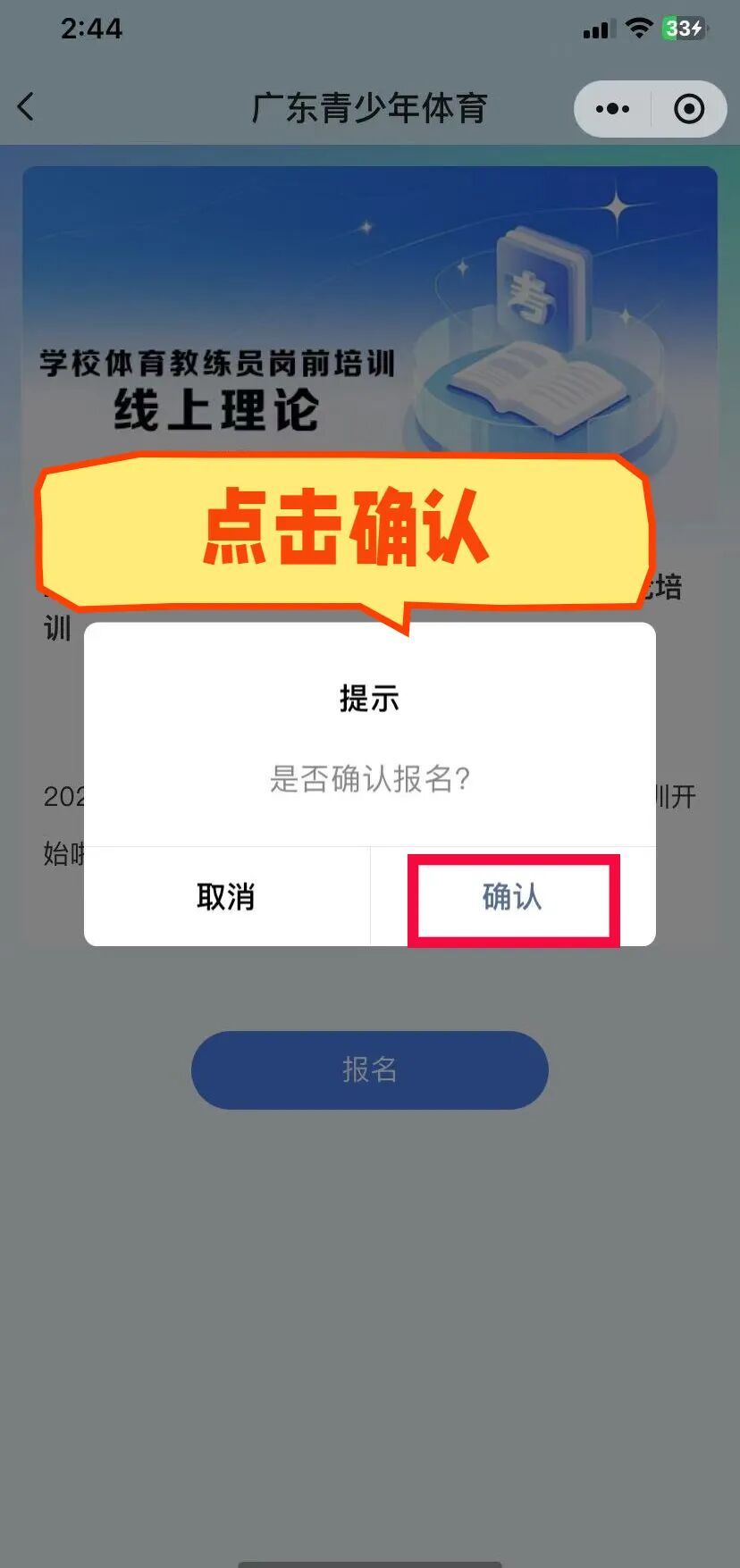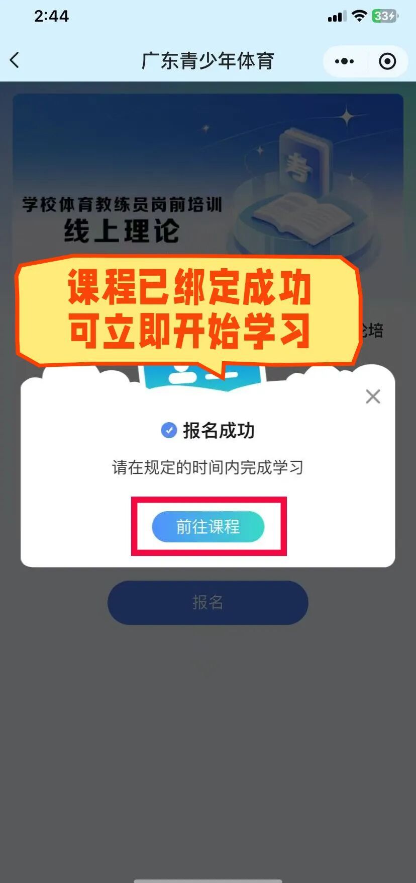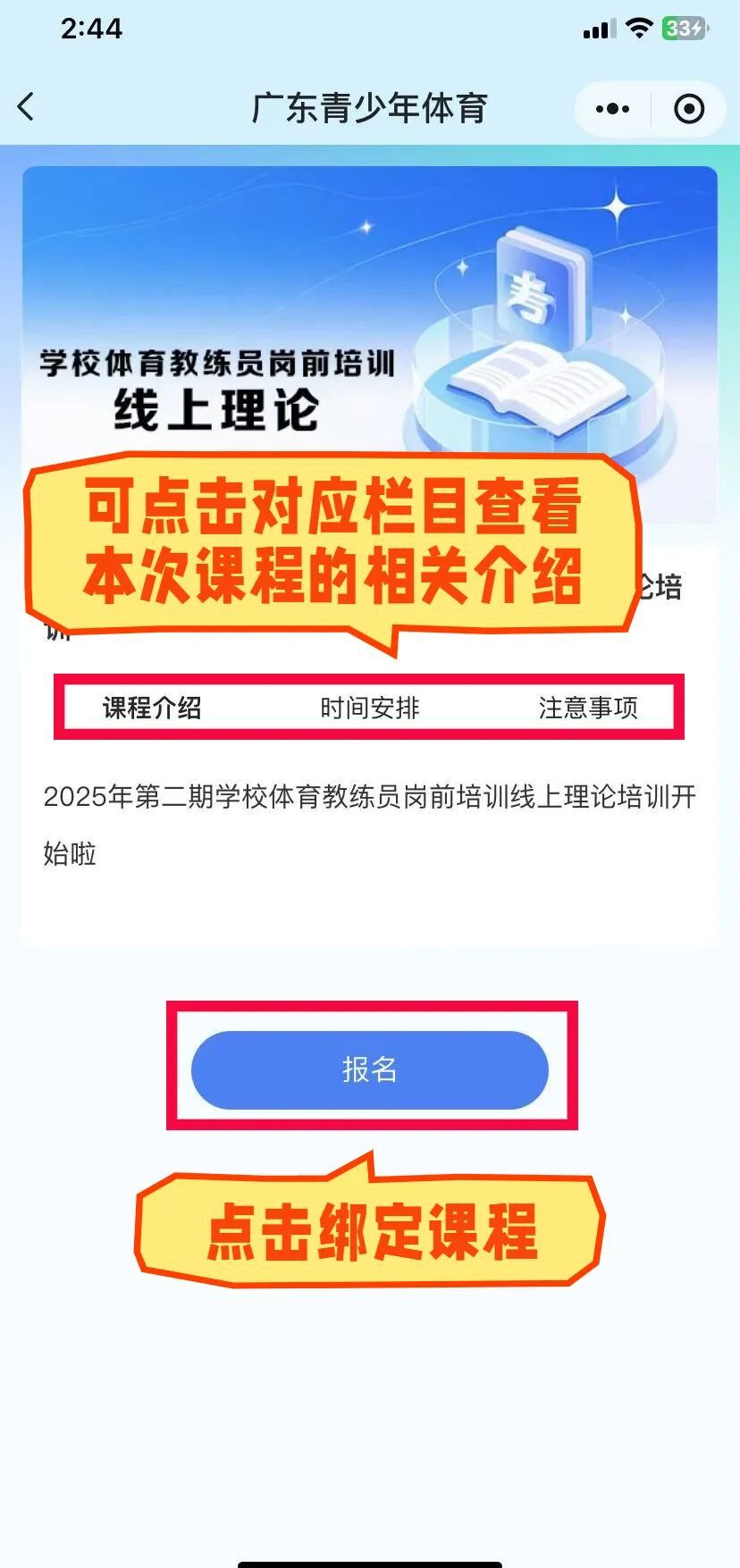 参训人员点击“广东青少年体育”公众号菜单栏“培训学习”—“岗前培训”进入培训平台首页,点击“培训考试”,直接在“热门课程”一栏找到对应课程进入相关界面。点击底部“报名”,即完成课程绑定。