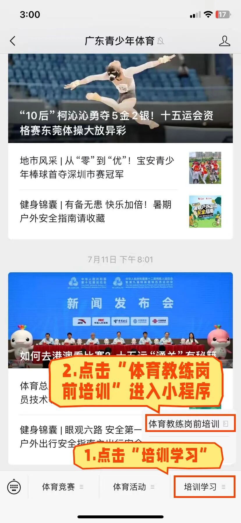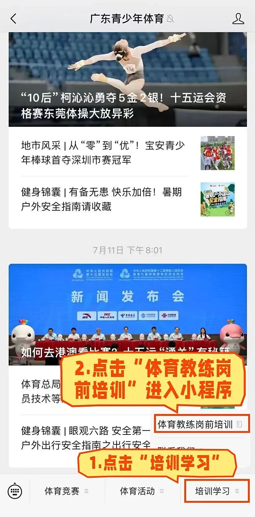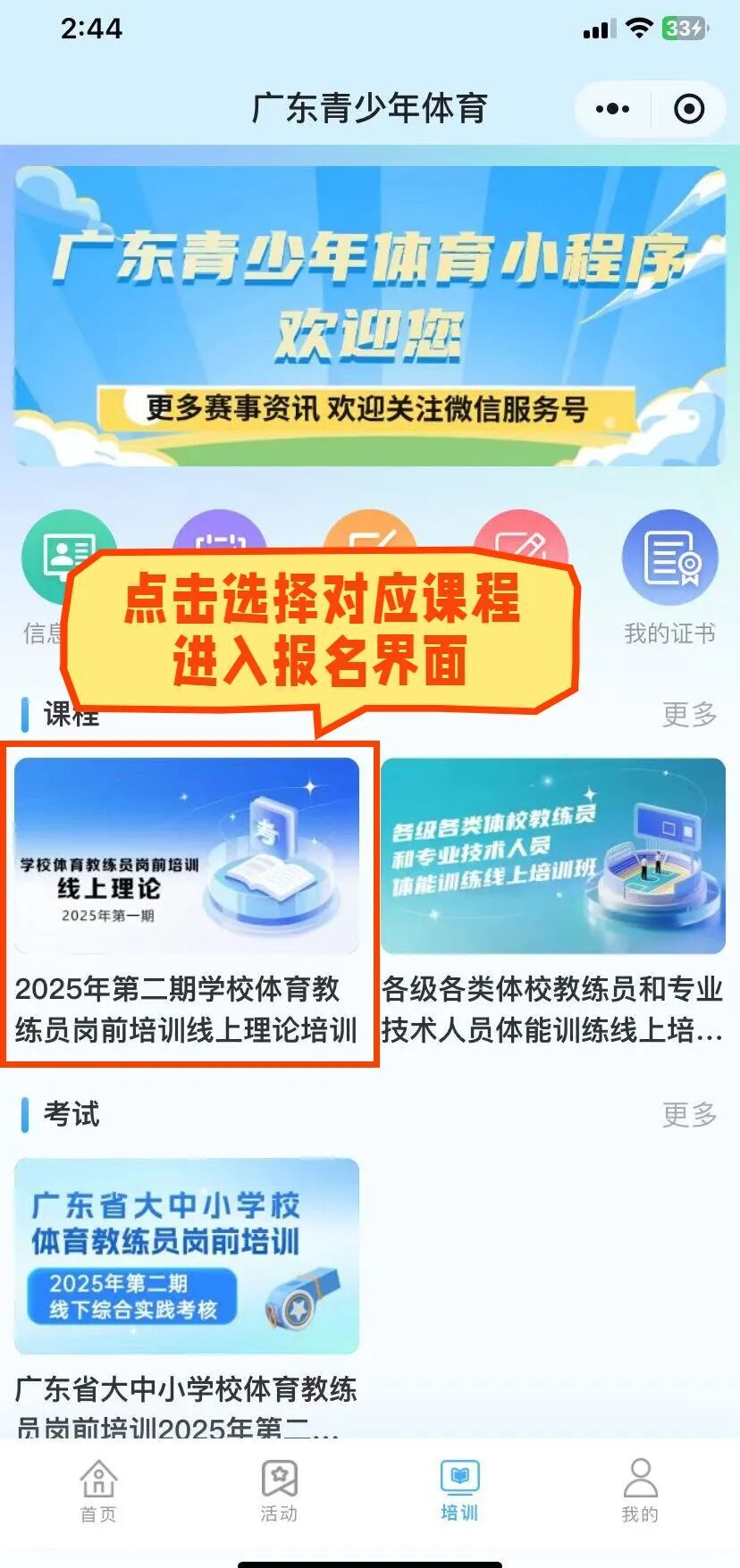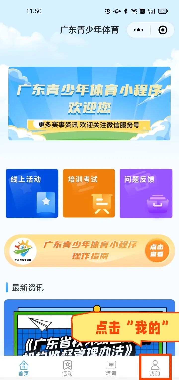 1. 进入小程序:9月29日24:00前,关注“广东青少年体育”服务号,点击菜单栏“培训学习”-“体育教练岗前培训”,进入小程序首页。